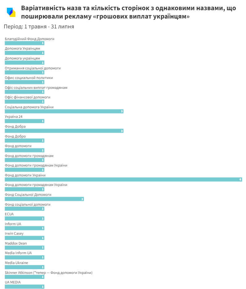 Однообразие названий этих страниц также наталкивает на мысль о привлечении в одну сеть. Например, количество страниц под названием «Фонд помощи Украины» — 6, а «Фонд Добра» — 3, и все они распространяли похожую рекламу на тему «денежных выплат для украинцев». Названия страниц однообразны — их отличают мелочи, например, строчная или прописная буква, наличие или отсутствие одного слова в названии.
