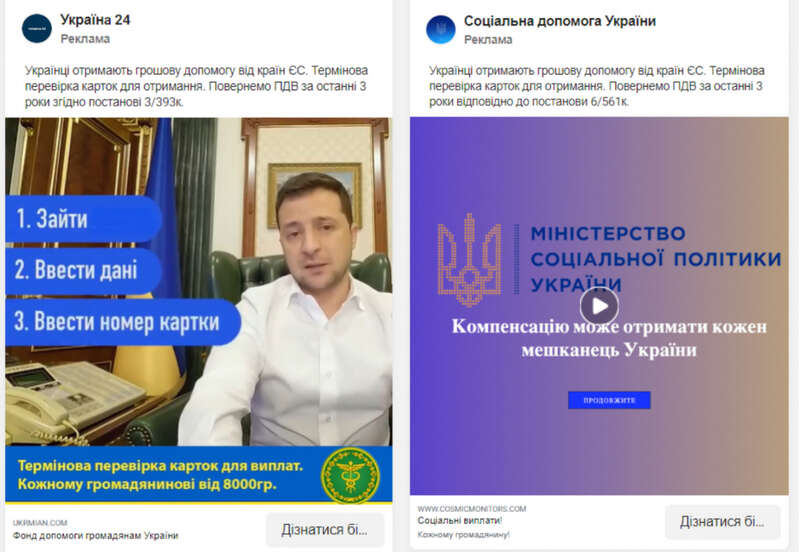 Такие рекламные сообщения опубликованы в разное время, с разных страниц и вроде бы от разных имен (Владимир Зеленский, Министерство социальной политики и т.п.), однако все с одним посылом — «денежные выплаты для украинцев». Только настоящая цель мошенников — не дать кому-то деньги, а присвоить себе чужие.