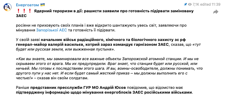 "Как вы знаете, мы заминировали все важные объекты Запорожской атомной станции. И мы не скрываем этого от врага. Мы их предупредили. Враг знает, что станция будет или русской, или ничьей. Мы готовы к последствиям этого шага. И вы, воины-освободители, должны понимать, что другого пути у нас нет. И если будет самый жесткий приказ – мы должны выполнить его с честью!", – цитирует заявления Васильева "Энергоатом" со ссылкой на некие российские новостные порталы и телеграмм-каналы.