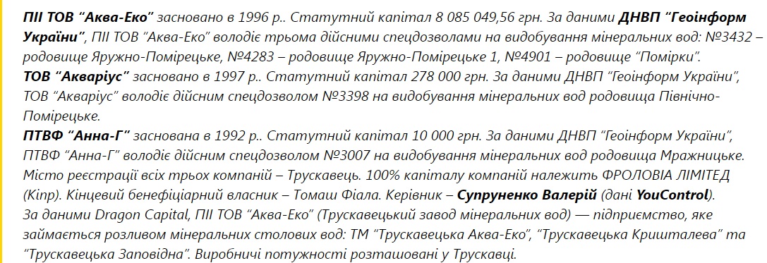 Dragon Capital еще в сентябре 2021 года приобрела компании, владеющие пятью спецразрешениями на добычу минеральных вод: ООО «Аква-Эко» владеет тремя действительными спецразрешениями на добычу минеральных вод (месторождения Яружно-Померецкое, Яружно-Померецкое 1, Померки); ООО «Аквариус» купило разрешение на месторождение Северо-Померецкое; ПТУФ «Анна-Г» - на месторождение Мражницкое.