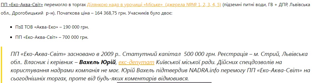 Аукцион по продаже спецразрешения на участок в урочище недр Городское (Міське) с пятью источниками состоялся 15 июля. Торги стартовали с 164,4 тысячи гривен. Наивысшую цену предложила компания экс-депутата Киевсовета Юрия Вахеля ЧП «Эко-Аква-Мир» – 700 тысяч гривен. Но разрабатывать недра будет ООО «Аква-Эко», предложившее втрое меньше – 190 тысяч.