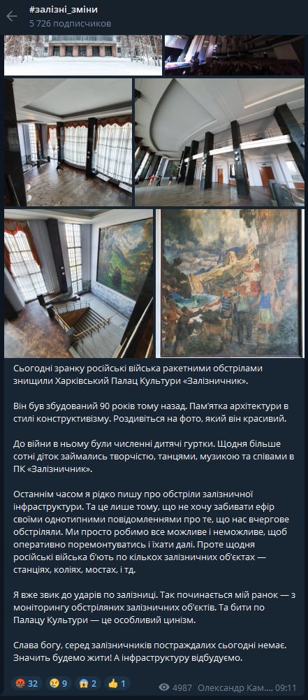 Также утренними ударами по Харькову уничтожен ДК "Железнодорожник", сообщил глава правления "Укрзализныци" Александр Камышин.