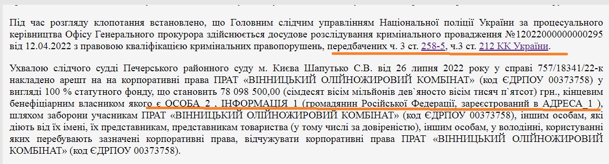 Как следует из материалов уголовного дела №12022000000000295 от 12 апреля 2022 года, на имущество всех этих компаний был наложен арест. Уголовное дело открыто по статьям 258-5 и 212 Уголовного кодекса Украины: