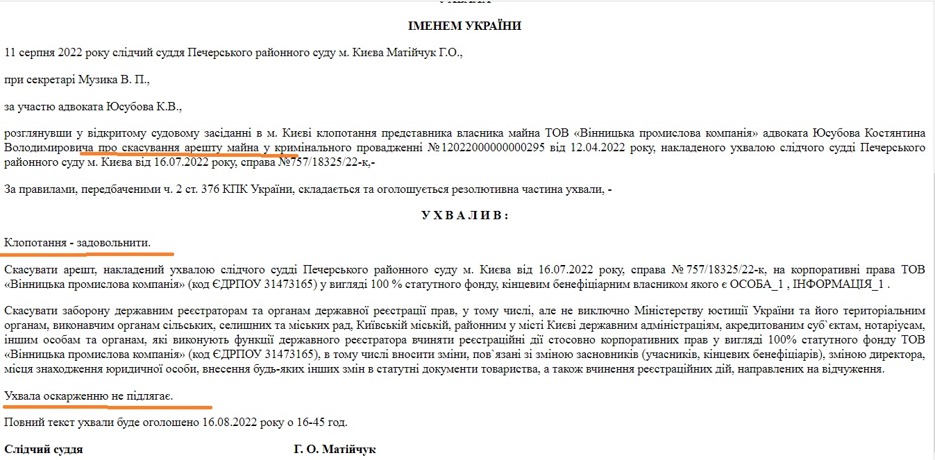 Арест с ООО «Винницкая промышленная компания» снял судья Печерского районного суда Матийчук Г.О.; с ЧАО «Винницкий масложировой комбинат» - судьи того же суда Батрин О.В. и Остапчук Т.В.: с ЧАО «Черновицкий масложировой комбинат» - судья того же суда Бусик О.Л.
