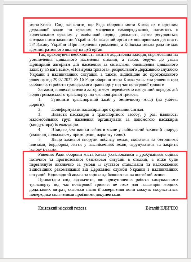 Мэр Киева Виталий Кличко ответил на петицию об отмене принудительной остановки общественного транспорта в столице во время воздушной тревоги. Предложение киевлян было отклонено.