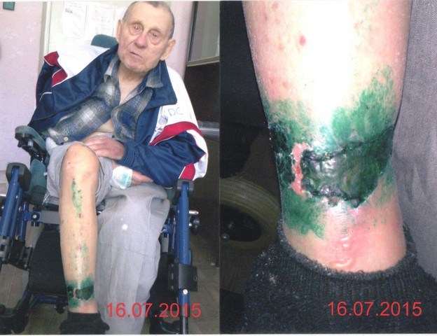 Перевод был назначен на 15.07.15. Из хосписа в Халявин перевозили транспортом горбольницы с сопровождающим. Когда жена пришла в день перевода, увидела жуткую картину: дедушку выкатили на кресле-каталке, а за несколько дней до этого он еще ходил. Лицо дедушки было изможденное, тело - в страшных синяках. Считаю, что так удариться нельзя. Я не медик, но понимаю, что просто так не возникают такие травмы. Здесь надо или ногами бить, или лежащего бить. Рука сломана в двух местах, опухшая и синяя. Это же следы пыток. На ноге нет кожи до кости. Я могу еще понять, что человек упал – и сломал руку. Но как оправдать остальное: раны, отеки, водянки?