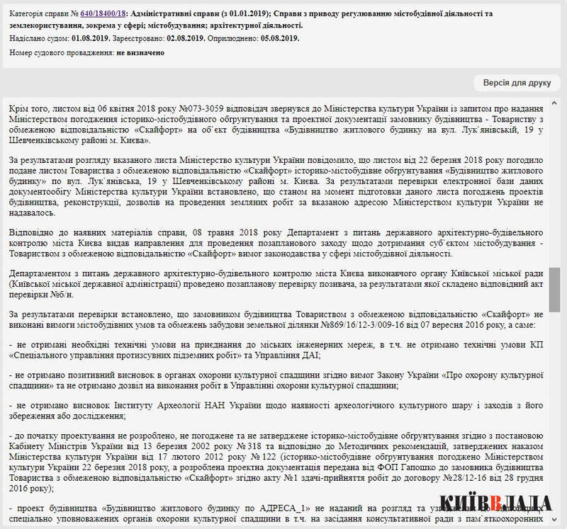 В частности, в Госгеокадастре установили, что земельный участок де-факто используется для строительства многоквартирного дома, а не "обычного" жилого дома. В свою очередь, Департамент Государственного архитектурно-строительного контроля Киевской горгосадминистрации (ГАСК КГГА) выяснил, что ООО "Скайфорт" перед началом работ не получило необходимые технические условия на присоединение дома к городским инженерным сетям, не согласовало проведение работ с органами охраны культурного наследия , не получило заключение Института Археологии НАН Украины о наличии археологического культурного слоя и мер по его сохранению или исследованию и т.д. Поэтому 16 августа 2018 года упомянутый департамент отменил право на начало выполнения строительных работ, приобретенное на основании упомянутого выше уведомления.