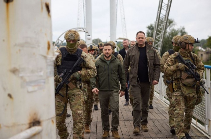 Президент Украины Владимир Зеленский приехал в деоккупированный Изюм в Харьковской области. Вместе с освобождающими украинскими воинами глава государства поднял флаг над населенным пунктом.