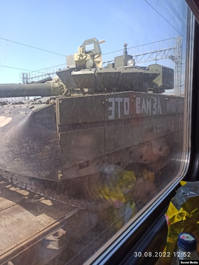 Этот же пользователь "ВКонтакте" (из хронологии снимков в его профиле следует, что он ехал из Крыма в центр России) выложил фотографию еще одного танка Т-80, но уже в более современной модификации "БВМ". Геотег в публикации указывает на то, что фотография была сделана на станции Кутейниково в Ростовской области. На борту танка написано "Это вам за ми…" – часть букв разобрать невозможно. Судя по всему, машина уже побывала в боях – однако по снимку сложно с определенностью сказать, в каком направлении следует состав.