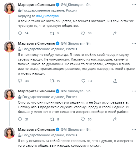 Об этом агитатор вторжения в Украину написала в Twitter. Симоньян клянется, что нет политических амбиций, служит только народу России, в чем вроде бы видит смысл своей жизни, пишет Обозреватель .
