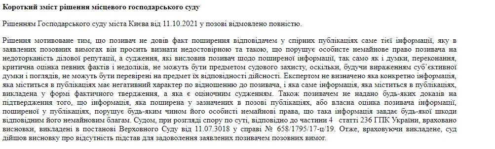 Также коллегия судей отметила, что в публикации Как «профсоюз» хочет парализовать ПриватБанк не указан и отсутствует конкретный текст с информацией о «незаконных целях деятельности Первичной профсоюзной организации сотрудников Акционерного общества коммерческого банка Приватбанк, о деятельности с целью навредить АО КБ Приватбанк и народу Украины».