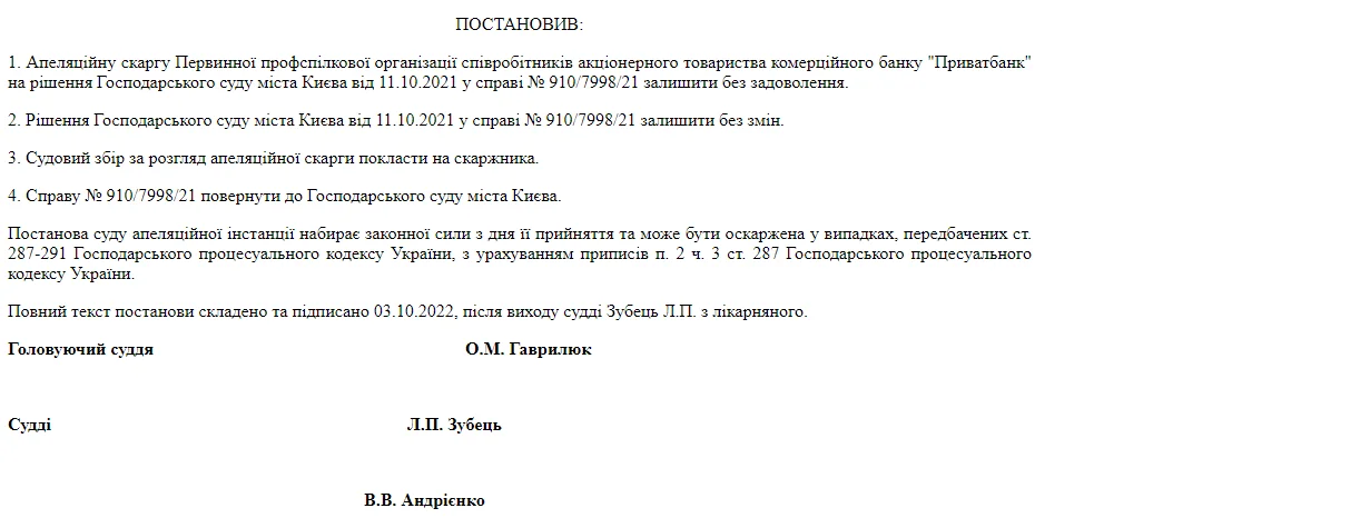 «Апелляционная жалоба Первичной профсоюзной организации сотрудников акционерного общества коммерческого банка Приватбанк на решение Хозяйственного суда в Киеве от 11.10.2021 по делу № 910/7998/21 удовлетворению не подлежит. Решение Хозяйственного суда в Киеве от 11.10.2021 по делу № 910/7998/21 следует оставить без изменений», — говорится в решении суда.