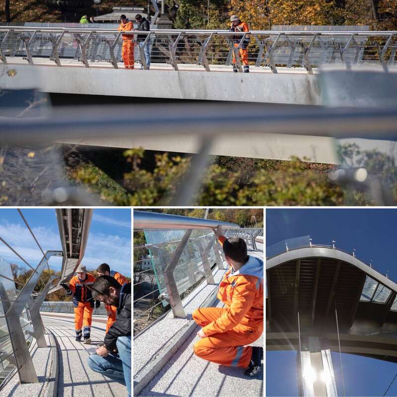 Во вторник, 11 октября, на пешеходно-велосипедном мосту в Киеве специалисты демонтировали поврежденные взрывом российской ракеты элементы стекла.