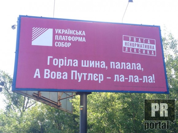 Ну и на постскриптум, все-таки, столично-позитивное. На розовых - что весьма редкое, единично-социалистическое явление в Украине - билбордах партии Украинская Платформа Собор в Киеве, появилось "ла-ла-ла" для "Вовы Путлера". "Горіла шина, палала, а Вова Путлєр - ла-ла-ла", - сообщают предвыборные щиты партии с пометкой "внимание ненормативная лексика". Конечно, без "слямзить" в данном случае, тоже не удалось, ведь за основу своего лозунга, "соборовцы" взяли известную речевку украинских ультрас. Однако, напомню, кто первый встал, того и "ла-ла-ла"...