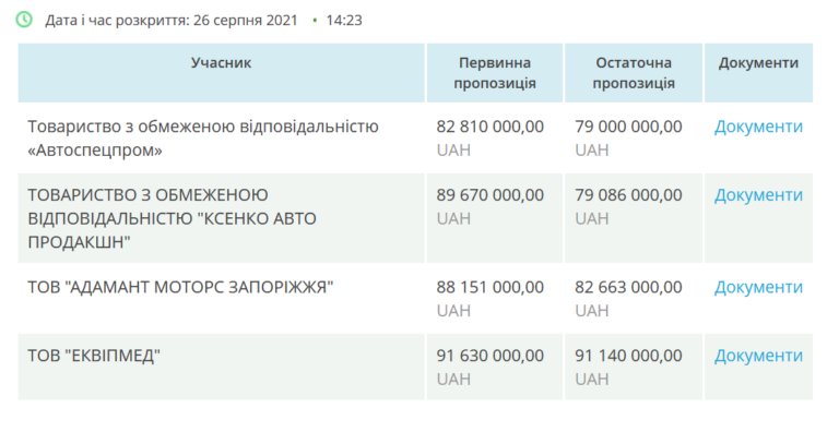МЗУ начало первую серию из четырех тендеров на четверть миллиарда гривен 10 августа 2021 года. В качестве иллюстрации возьмем вот эту закупку «скорых» ожидаемой стоимостью 92 млн грн (остальные такие же).