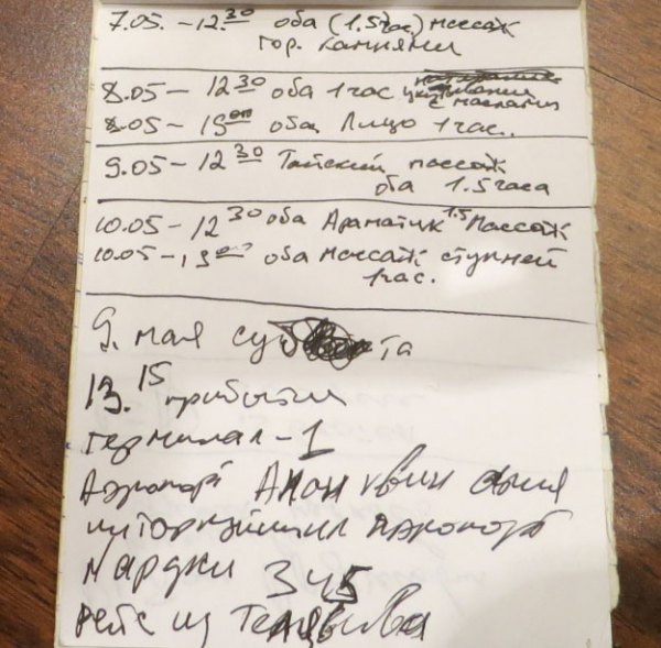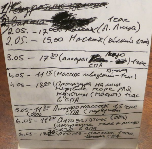"2 мая – 17:00 – массаж лица; 19:00 – массаж тайский, 1 час
