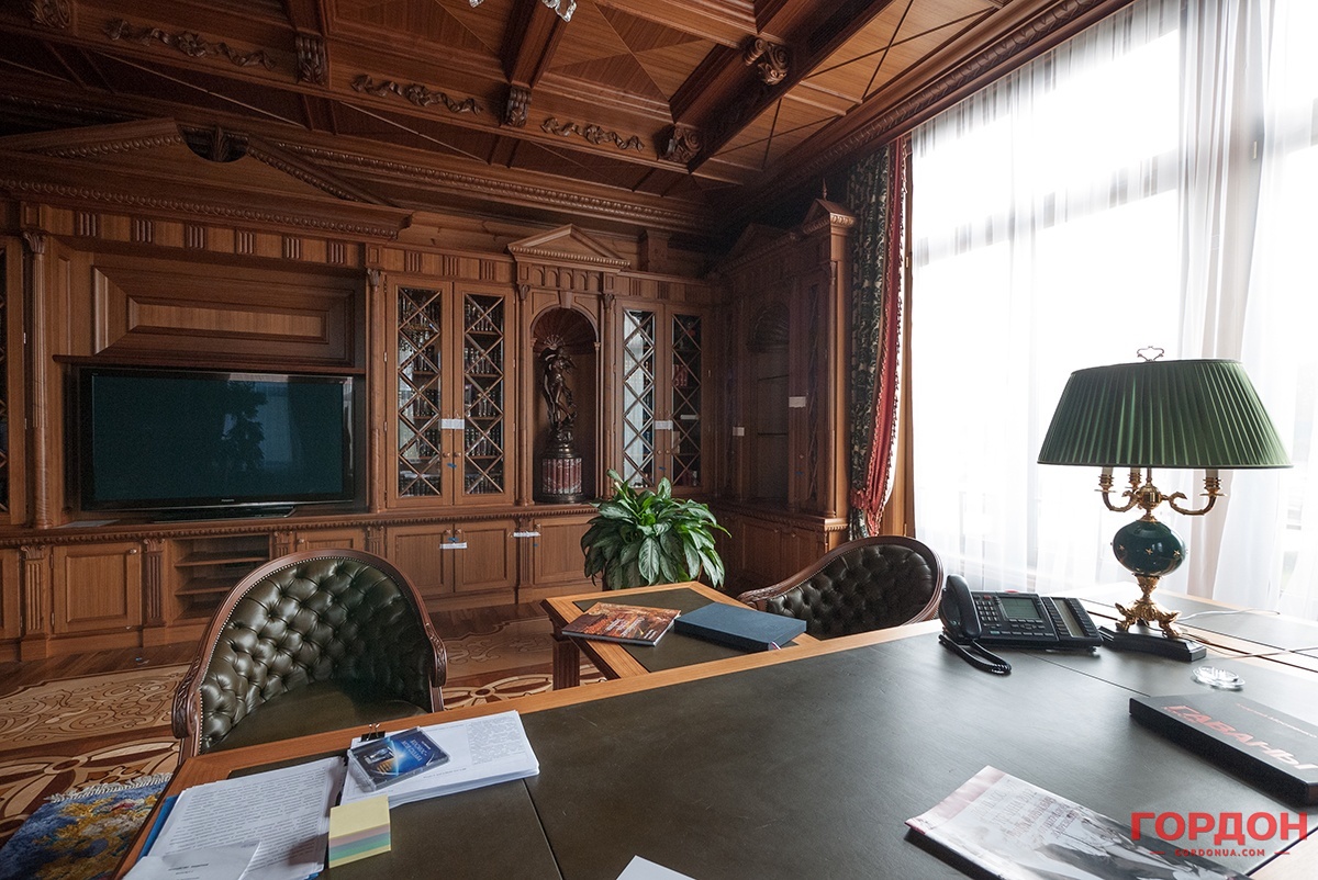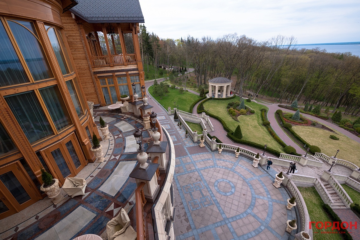 Дворец, который на карте "Межигорья" фигурирует как клубное здание "Хонка", состоит из четырех уровней: со стороны Киевского моря четыре этажа, с фасадной, выходящей к въезду на территорию "Межигорья", – два. Внутри все облицовано деревом – в основном ливанским кедром (древесина от немецкой компании класса люкс "Брюнольд"). Команда немецких специалистов установила специальное оборудование, чтобы драгоценная отделка не портилась из-за проседания дома.