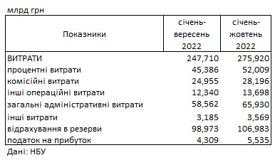 По данным НБУ, доходы банков за январь-сентябрь 2022 составили 286,899 млрд гривен, расходы 275,920 млрд гривен.