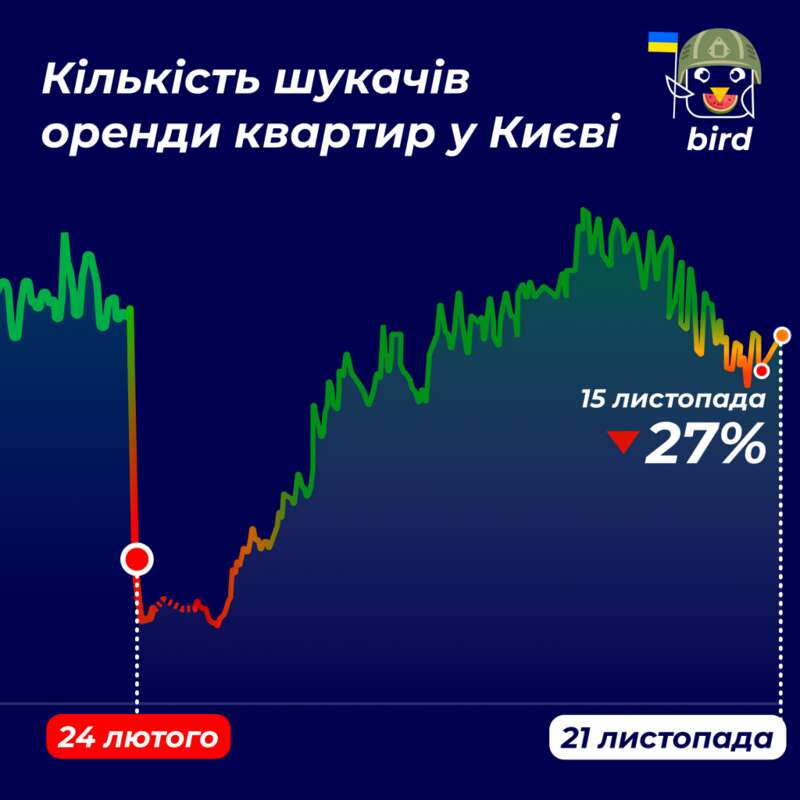 Число желающих снять квартиру стремительно упало в период с 15 по 21 ноября, а именно на 27%. Мы можем наблюдать постепенное восстановление довоенных цен на недвижимость и вновь резкое падение кризиса.