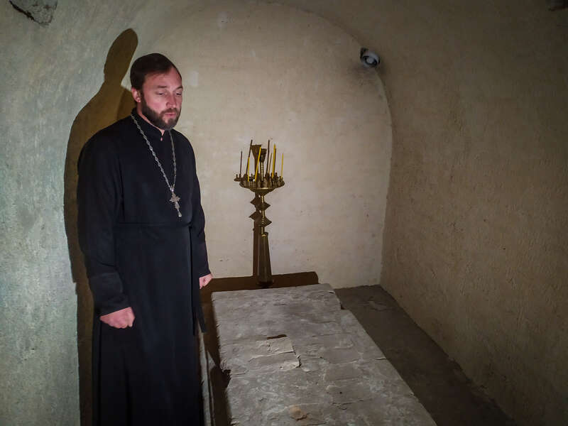 Отец Илья показывает подвал, где лежали останки Потемкина, но о том, кто и как их вывозил, рассказывает неохотно. Отодвинув ковровую дорожку, он открывает деревянную дверцу в полу храма и спускается вниз по каменной лестнице в небольшое помещение с каменным постаментом.