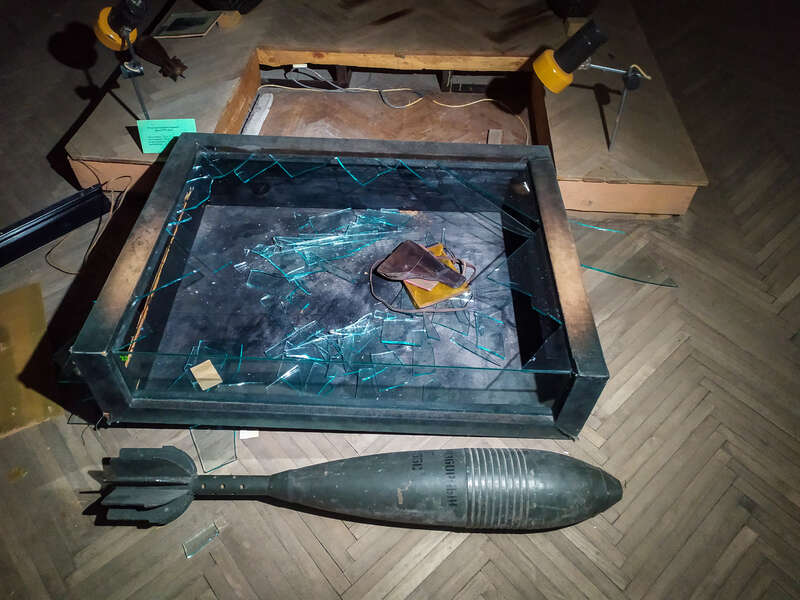 В зале о Второй мировой тоже много битого стекла, рядом с разбитым стеллажем лежит мина миномета. Кто-то вытащил ее, но потом все же оставил.