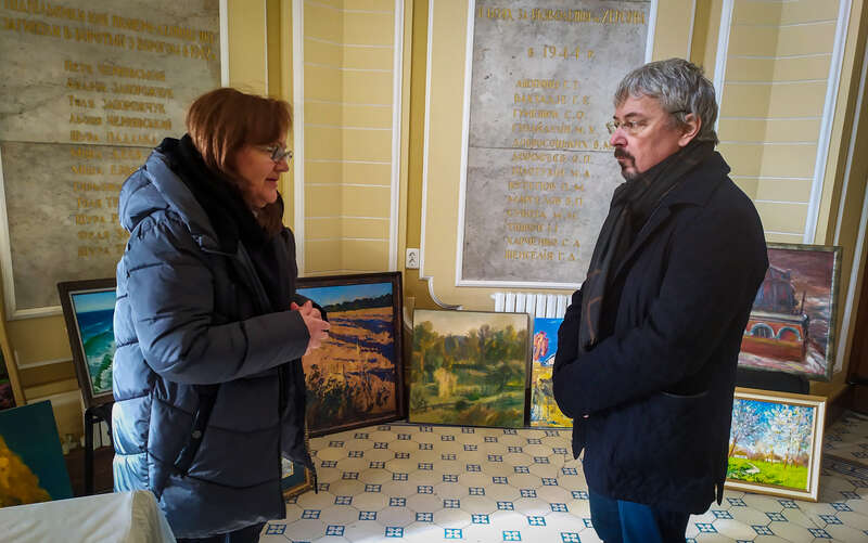 Распрощавшись с министром, который отправился в Краеведческий музей, директор Алина Доценко, экспрессивная женщина, в толстых очках и дутой куртке, приглашает корреспондента «Грат» посмотреть музейные фонды. Темное помещение разделено на две части рядами стеллажей с картинами. Большинство из них пустые.