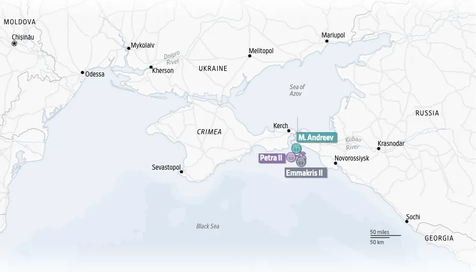 14 июня данные отслеживания судов и спутниковые изображения показали, что корабли "М. Андреев", Emmakris II и Petra II все еще находились вблизи Керченского пролива. По данным украинской разведки, "М. Андреев" предварительно был загружен ячменем в порту Севастополя. Погрузка продолжалась и 15 июня.