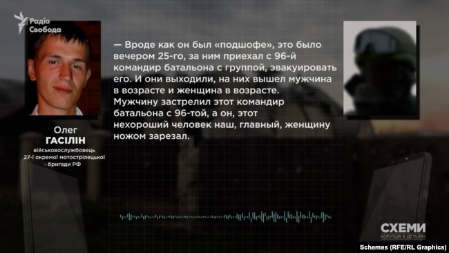 «Вроде бы он был пьян, это было вечером 25-го, за ним приехал из 96-й командир батальона с группой, эвакуировать его. Они выходили, на них вышли пожилые мужчина и женщина. Мужчину застрелил этот командир батальона из 96-й, а он, этот нехороший человек наш – главный – женщину ножом зарезал», – рассказывает Гасилин.
