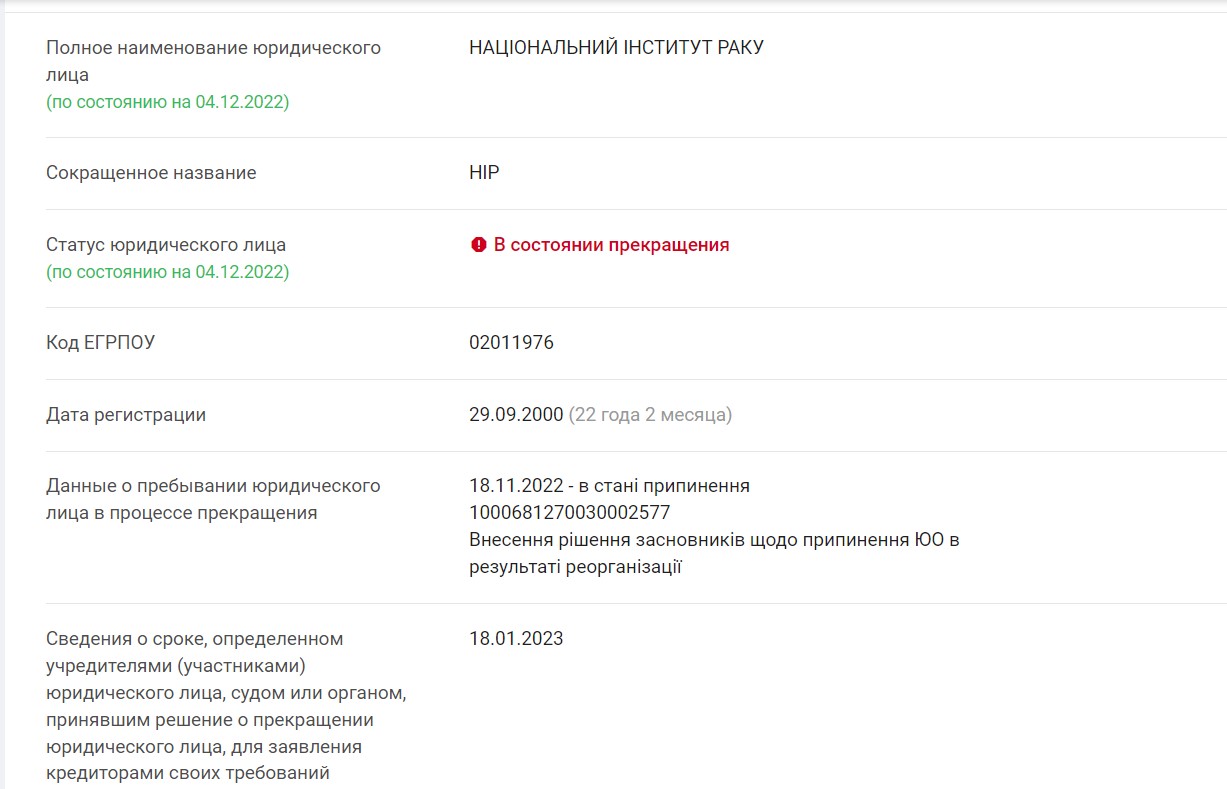 Так что дело об обмане пациента на 400 000 гривен никуда не движется. Зато движется Национальный институт рака – к своей ликвидации. По состоянию на 04.12.2022 года Институт находится в стадии прекращения: