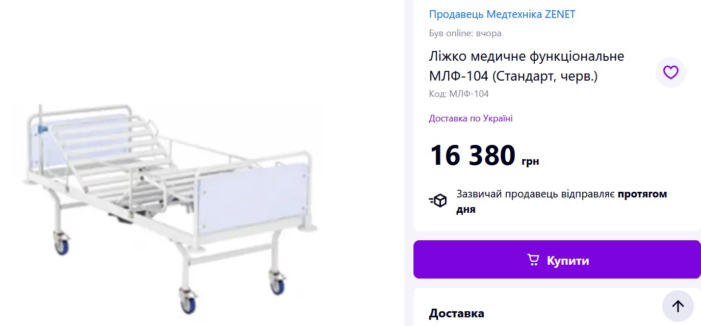 Стандартные медицинские кровати МЛФ-104 приобретены по 30 515 гривен (376 штук от украинского производителя ООО «Ир сом»). Они тоже есть в свободной продаже вдвое дешевле — по 16 тысяч гривен: