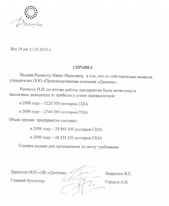 После задержания Ивана Рынжука в офисе «СИТИ-инвест» Березовского найден оригинал справки по выплате Рынжуку дивидендов и доходов по итогам работы фирмы «Джемма»: в 2008 году – 3 млн. 220 тыс. долл., в 2009 году – 4 млн. долларов. тыс. дол.