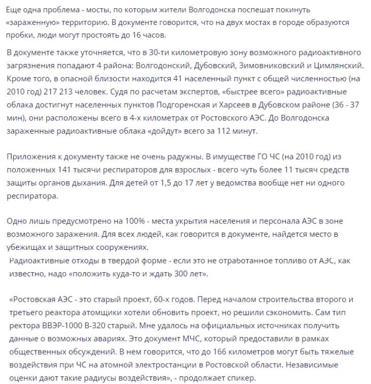 «В документах говорилось, что сотрудники АЭС не успеют подключить передвижные насосные агрегаты в случае отказа резервного генератора. Обесточение может произойти при аварии на линиях электропередач. Если генератор не сработает, через 5,5 часа расплавится и корпус реактора, и бетон шахты, и разнесет энергоблок. Это данные самих ростовских атомщиков. Все "безопасно и все хорошо", а если все пойдет не так, они скажут: "мы такое не говорили, сама общественность позволила нам работать", - говорит он.