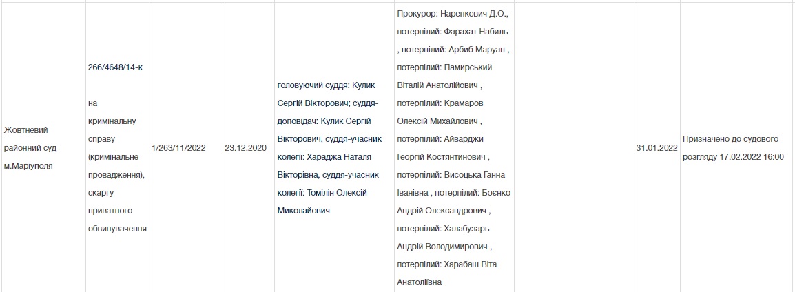 Считается, что благодаря этой "протекции" в октябре 2018 года Харакозов оправдали из-за признания недопустимой части доказательств совершения семьей этнических греков дерзких убийств. В 2020 году Верховный суд отменил это решение, направив громкое дело на новое рассмотрение в Октябрьский райсуд Мариуполя. Согласно сведениям портала "Судебная власть", очередной датой проведения слушаний была запланирована дата за неделю до начала широкомасштабного военного вторжения армии РФ на территорию Украины – на 17 февраля 2022 года.