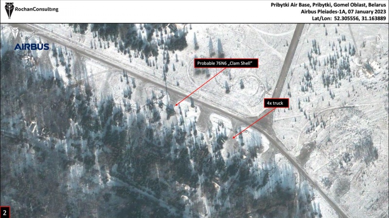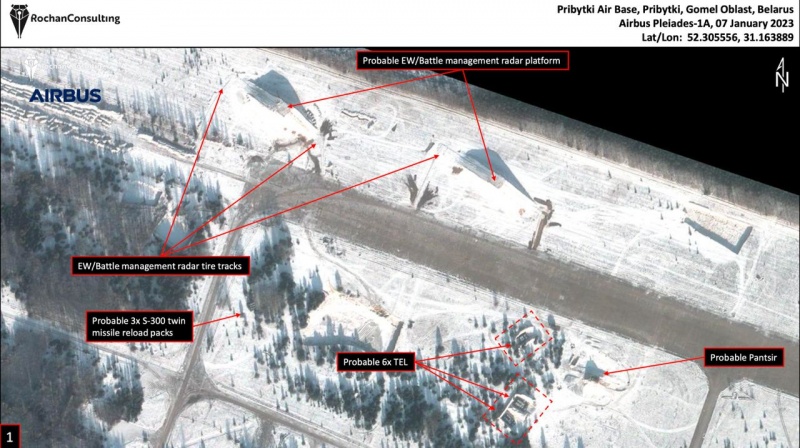 На свежих фото аэродрома "Зябрівка" в Гомельской области можно увидеть дивизион из 9 единиц зенитно-ракетных комплексов С-300/400, которые находятся там уже длительное время. Кроме того, там размещен ЗРПК "Панцирь", стоящий на насыпи грунта, грузовые машины, а также несколько радаров, которые Rochan Consulting определил как 76N6 и 64N6E.