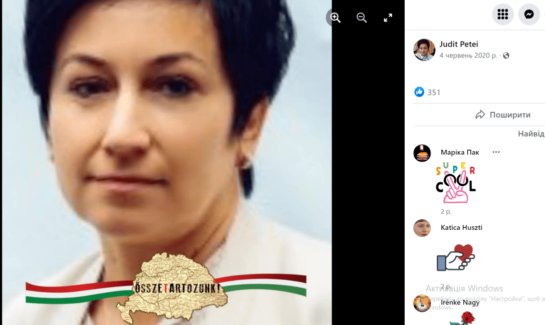 Сообщается, что фотографию, где половина области изображена с венгерским флагом, Юдита Петеи опубликовала на обложке личной страницы в Facebook. На изображении было написано "Боже, храни Закарпатье" на венгерском языке.![]()