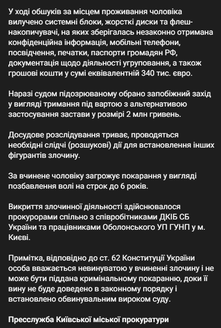 В ходе обысков по месту жительства мужчины изъяты системные блоки, жесткие диски и флешки, на которых хранилась незаконно полученная информация, мобильные телефоны, удостоверения, печати, паспорта граждан РФ, документация о деятельности группировки, а также денежные средства в сумме 3 тыс. евро.
