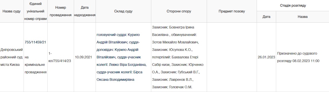 Дата исчезновения Зотова в столичном Управлении стратегических расследований Нацполиции указана 26 января 2023 года. В тот день в Днепровском райсуде Киева было запланировано рассмотрение дела по обвинениям Михаила Мовлаевича в совершении в декабре 2019 года умышленного убийства по корыстным мотивам 41-летнего гражданина Украины Феликса Бахвалова (п.6 ч.2 ст.115 УК Украины), незаконному (ч.1 ст.263 УК Украины), использовании специальных технических средств (ч.1 ст.359 УК Украины) и умышленном поджоге имущества (ч.2 ст.194 УК Украины).