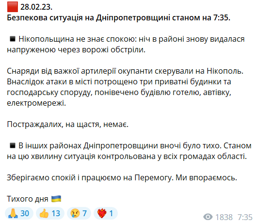 В ночь с 27 на 28 февраля россияне ударили из тяжелой артиллерии по Днепропетровской области. Под обстрел попал Никополь.