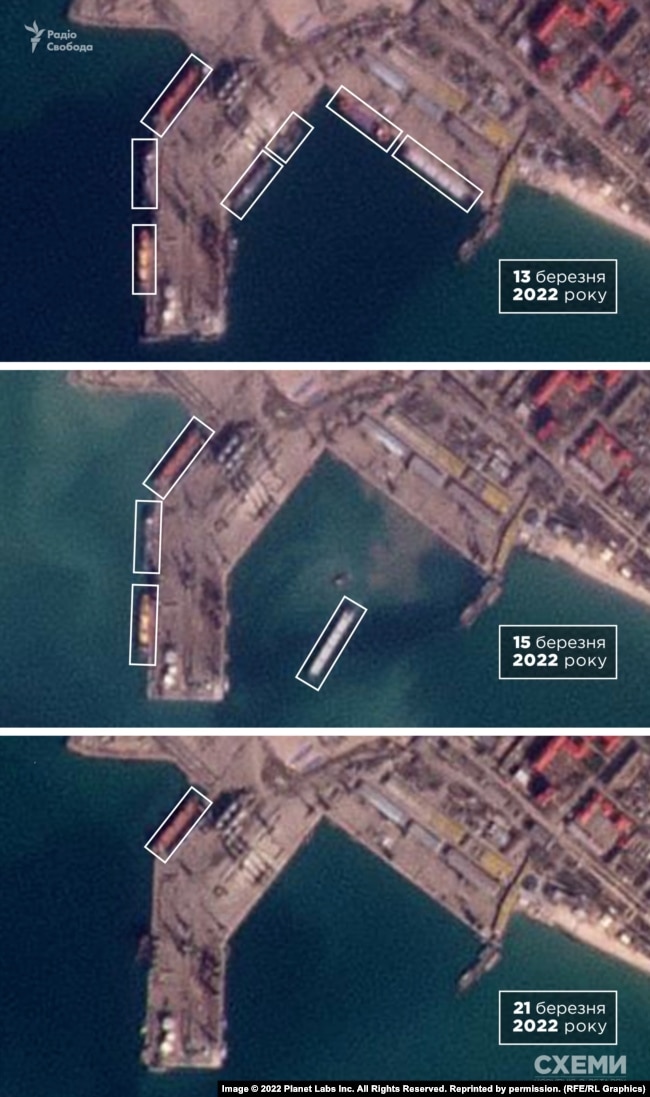 В распоряжении «Схем» есть спутниковые снимки за тот период, на которых можно увидеть движение судов окупантов возле упомянутого Богуслаевым девятого причала.