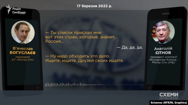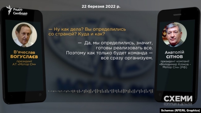 В распоряжении «Схем» есть разговор, также свидетельствующий о другом. В августе 2022 года, на 8-й месяц полномасштабной войны России против Украины, Дзюба и Богуслаев лицом к лицу обсуждают схему поставок двигателей для этой страны – называя их «катушками».