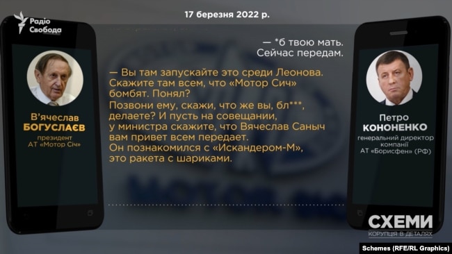 – Вы запускайте это среди Леонова. Скажите всем, что «Мотор Сич» бомбят. Позвони ему, скажи: что вы, бл***, делаете? И пусть на совещании у министра скажет, что Вячеслав Саныч вам привет всем передает. Он познакомился с "Искандером-М", это ракета с шариками.