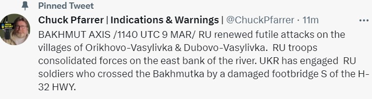 Позже он опубликовал еще одну карту и прокомментировал ее. По словам Пфаррера, "РФ возобновила безрезультатные атаки на села Орехово-Васильевка и Дубово-Васильевка". Также, добавил он, войска России сосредоточили свои силы на восточном берегу реки. ВСУ вступили в бой с российскими солдатами, которые пересекли Бахмутку по поврежденному пешеходному мосту автострады Н-32, пишет обозреватель.