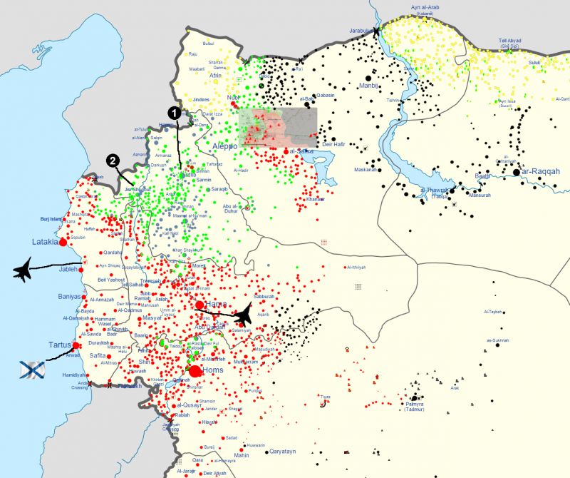Чёрные точки - ИГИЛ. Жёлтые точки - курды. Красные точки - силы Асада, правительственные войска. Зелёные точки - повстанцы. Серые точки - фронт ан-Нусра, «местный филиал» Аль-Каиды.