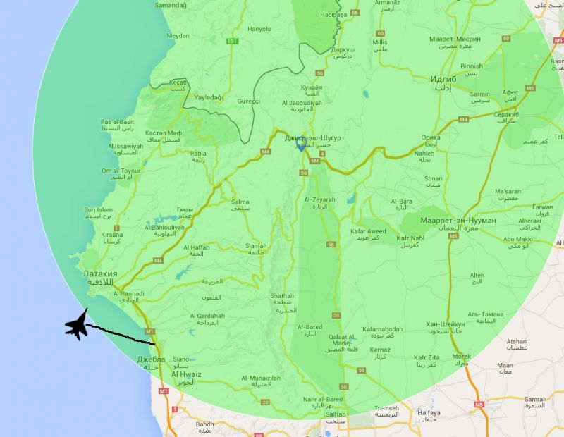 Но если мы передвинем центр окружности ближе к западной границе губернаторства Идлиб (о чём говорилось в сообщении ан-Нусра), например ближе к городу Йиср аш-Шугур, где идут столкновения между правительственными войсками, повстанцами и ан-Нусра, то в окружность идеально попадает авиабаза около Латакии: