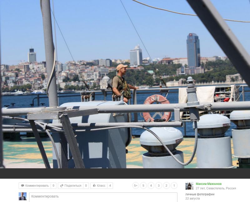 Внимание сразу же зацепилось за фотографию на его аватарке: он стоит в военной форме и с оружием в руках на палубе БДК, а на заднем фоне виден Босфорский мост. Эту фотографию он загрузил 29 марта 2015-го: