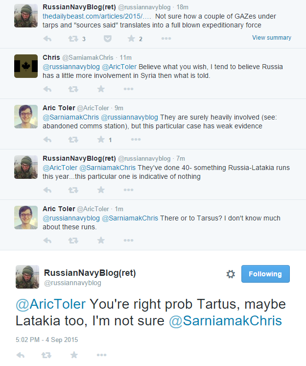 На данный момент весь этот массив фотографий наших военных в Сирии говорит только о резком смене курса и переброске войск в Сирию (необязательно именно для участия в войне). Т.е. до 2013-го года включительно там весь штат состоял из 4-х человек, потом и их эвакуировали, во избежание инцидентов с российскими военными и во избежание эскалации конфликта (потому и не найти сейчас фотографий наших военных в Тартусе ранее 2015-го года), а с весны 2015-го пункт внезапно стал очень важен (хотя ранее заявляли совершенно обратное) и туда начали перебрасывать наши войска. Важно: в отличие от начала года и более ранних лет, перебрасывают в Тартус именно контрактников, причём на длительный срок (от 3-х до 8-и месяцев). Ранее, в начале этого года и в более ранние года, на фотках из Тартуса мелькали и срочники, причём по фотографиям было ясно видно, что они прибывали на очень короткий срок - очевидно для обслуживания корабля. Сейчас срочники с фотографий из Тартуса исчезли.
