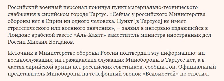 С 1971-го года у России есть в сирийском городе Тартусе есть пункт материально-технического обслуживания ВМФ (не военно-морская база, подчёркиваем снова). С 1991-го года этот пункт никакого особого значения не имел, туда осуществлялись разовые походы наших кораблей для обслуживания. Весь штат пункта состоял из четырёх российских военнослужащих. В 2010-м году российские власти задумались о преобразовании пункта в полноценную военно-морскую базу, но в 2011-ом случилась Арабская весна и началась гражданская война в Сирии. Во избежание всяких там инцидентов, в 2013-ом с пункта эвакуировали весь российский персонал, в том числе гражданский. Позднее, в комментариях прессе, заместитель министра иностранных дел Михаил Богданов говорит, что пункт никакого стратегического или военного значения не имеет, что все военнослужащие и гражданский персонал пункта эвакуированы в Россию, чтобы не подвергать их опасности и чтобы не приводить к эскалации вооружённого конфликта в Сирии. Среди эвакуированных были также и военные советники.