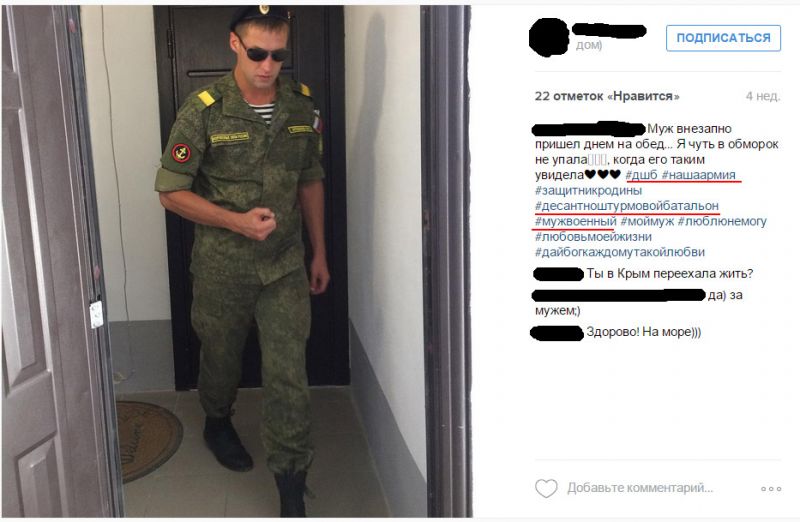 Установив адреса профилей Юлии в соцсетях, мы установили профиль её мужа, Юрия Артамонова (сохранённая копия). Тот факт, что Юрий Артамонов - действующий военнослужащий, морпех, подтверждается не только постом Юлии на женском форуме, но и многочисленными снимками в её инстаграме: