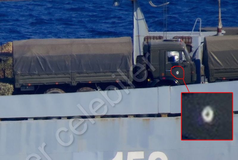 Забегая немного вперёд, возьмём один из снимков сайта turkishnavy.net, на котором 22 августа снят проплывающий пролив Босфор БДК «Николай Фильченков» с военной техникой на палубе и присмотримся к одному из военных КамАЗов - похоже это наши старые знакомые: