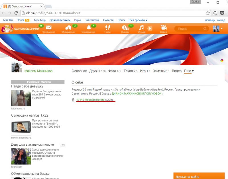 После Анатолия Голота мы стали искать профили других военнослужащих в/ч 13140 (810-ая Отдельная бригада морской пехоты) и натолкнулись на профиль контрактника этой бригады, Максима Мажникова: